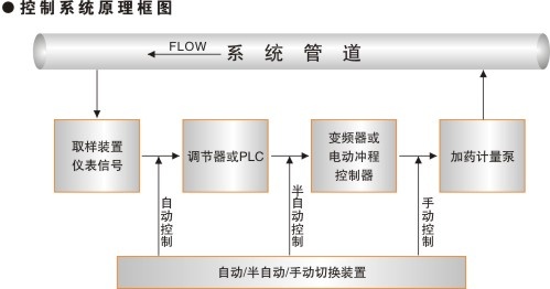 在自動控制柜內(nèi)設(shè)有獨立的動力電源,由所對應的電源開關(guān)控制,采用變頻控制器和數(shù)顯PID調(diào)節(jié)器或PLC對計量泵電機進行控制, 通過帶電氣和機械互鎖的轉(zhuǎn)換開關(guān)及中間繼電器實現(xiàn)三種工作狀態(tài):自動、半自動、手動控制模式。在自動控制模式下,數(shù)顯PID調(diào)節(jié)器或PLC接收來自取樣分析儀表變送器輸出的4-20mA信號,根據(jù)用戶要求的指標設(shè)定值經(jīng)PID運算后輸出調(diào)節(jié)型4-20mA信號調(diào)節(jié)變頻器的頻率輸出,完成對計量泵電機轉(zhuǎn)速的閉環(huán)自動控制。在半自動控制模式下,計量泵的控制脫離外部儀表信號的閉環(huán)控制,操作人員可直接調(diào)節(jié)變頻器的電位計調(diào)節(jié)旋紐實現(xiàn)對計量泵電機轉(zhuǎn)速的控制。在手動控制模式下,計量泵電機的運行狀態(tài)脫離了變頻器輸出的控制,完全是在交流工頻三相電源直接供電的形式下運行,對計量泵流量的調(diào)節(jié)依靠手動調(diào)節(jié)計量泵的沖程調(diào)節(jié)手柄來實現(xiàn)??刂葡到y(tǒng)中采用的PID數(shù)字顯示調(diào)節(jié)器或PLC還可以實現(xiàn)對測量指標效果的動態(tài)監(jiān)視。